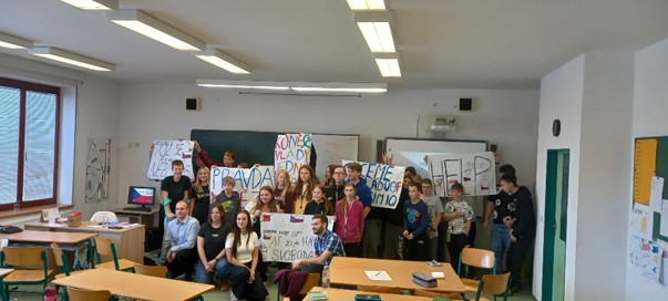 Dne 28. 11. k nám zavítal pan doktor Hanáček z Jihočeské univerzity spolu se svými studenty, aby pro žáky 2. stupně připravili vzdělávací program na téma 17. listopadu. Na úvod jsme se seznámili s historickými událostmi, které se k tomuto významnému dni vztahují. Poté jsme se rozdělili do skupin a pracovali na jednotlivých stanovištích – vyráběli jsme transparenty, pracovali s dobovými články a sledovali „cestu od Albertova“. Na závěr jsme si společně zazpívali Modlitbu pro Martu a s transparenty v rukou si připomněli atmosféru tehdejších událostí. Program byl velmi poutavý a přínosný.