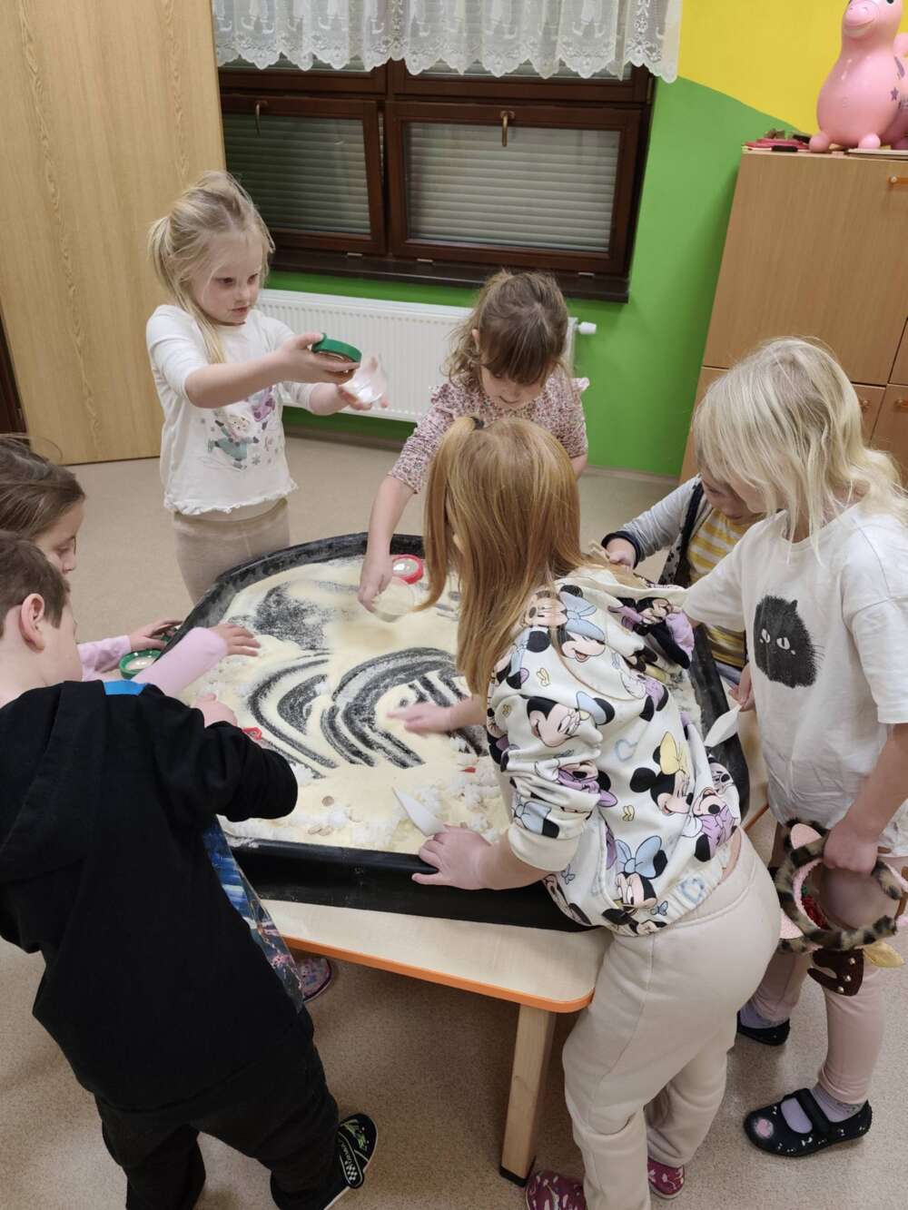 K dispozici máme také lupy, a tak se z dětí rázem stávají malí badatelé, kteří mohou vše pečlivě zkoumat a pozorovat zblízka. V těchto dnech paní učitelka připravila dětem sypký materiál – krupici, se kterou si děti hrály nejrůznějšími způsoby. Nabíraly ji, přesýpaly, pozorovaly lupou a prsty či pomůckami do ní kreslily vlastní obrazce.