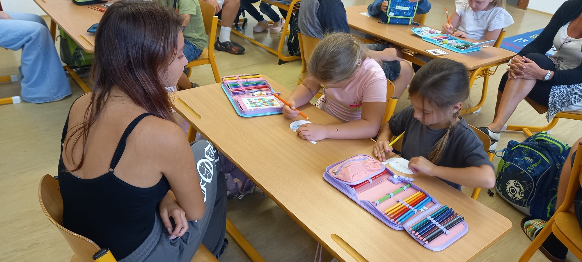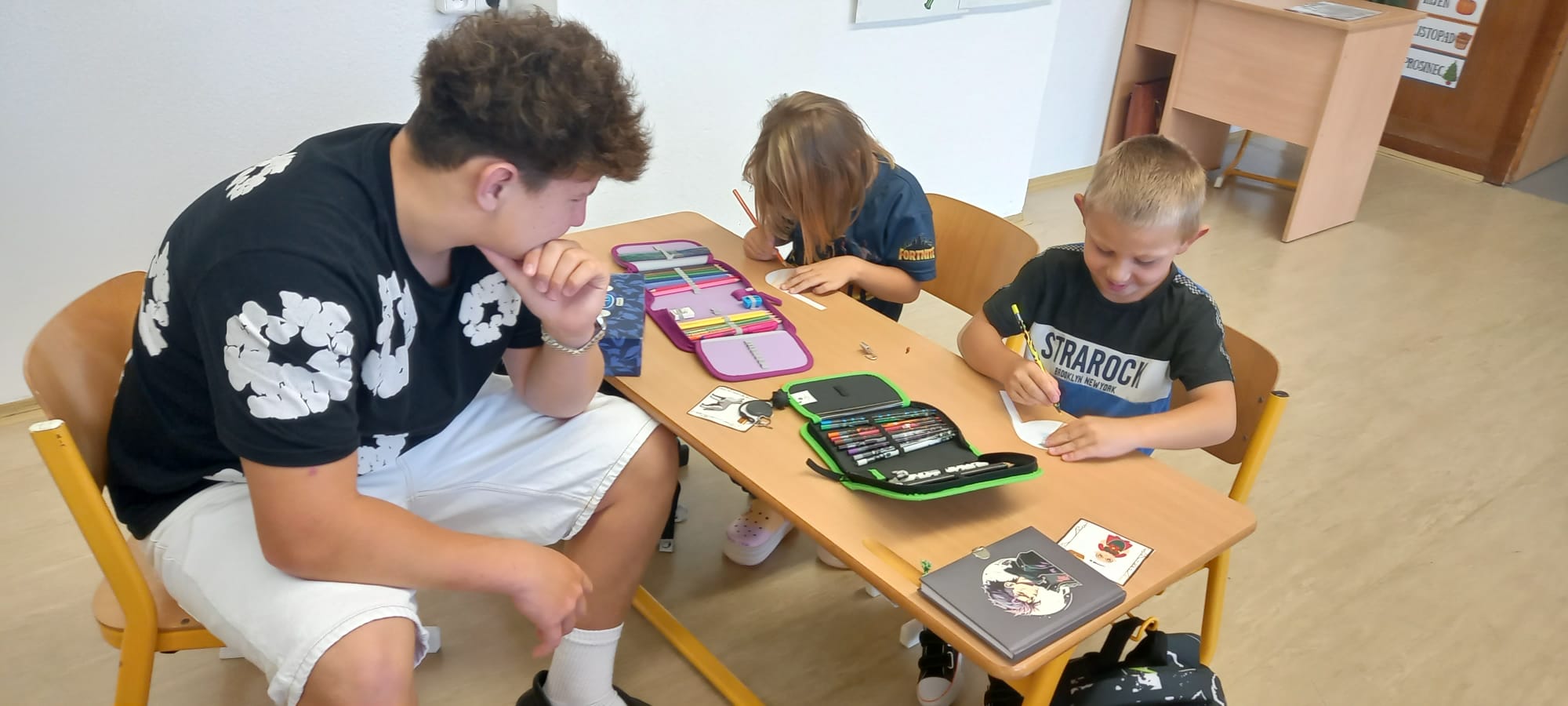 Poté se rozdělili do skupin podle trixesa a pustili se do tvoření papírových notiček. Každý přidal svůj kousek práce i fantazie a nakonec je společně pověsili na nástěnku. Nyní budou notičky čekat, až prvňáčci vyrostou – a v deváté třídě si je odnesou domů jako krásnou vzpomínku na své úplné začátky.