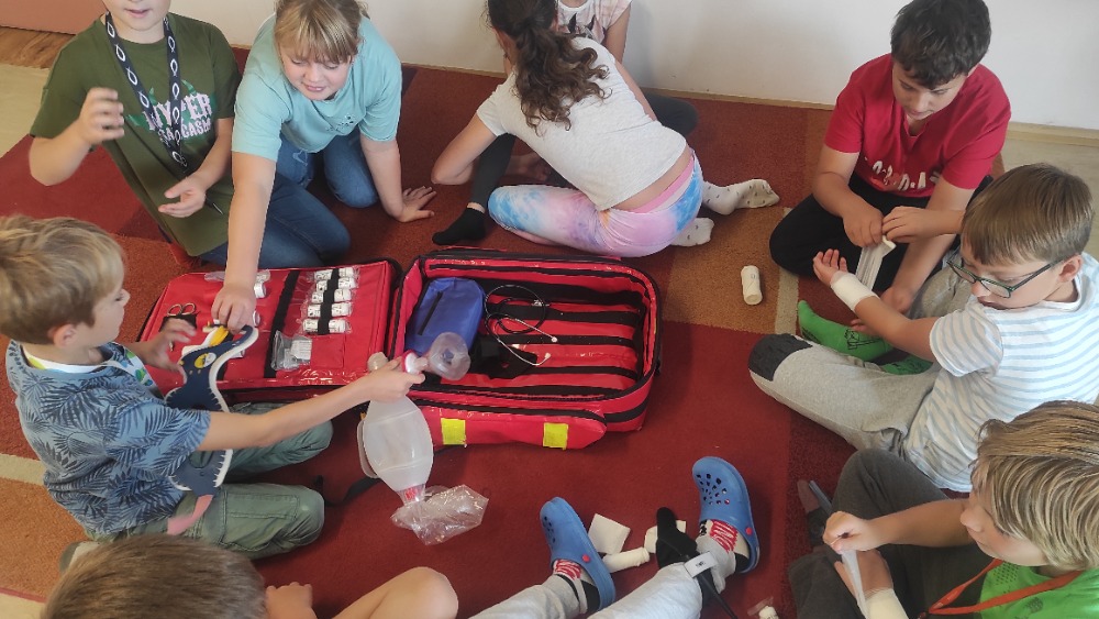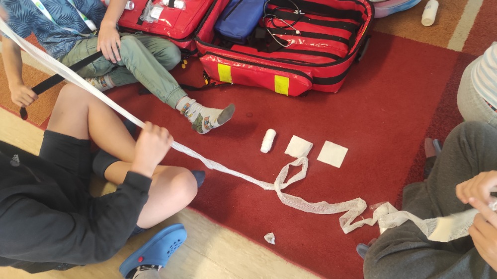 Žáci 4. třídy si vyzkoušeli 1. pomoc pomocí vybaveného zdravotnického batohu. Žáci měli k dispozici obvazy, obinadla, náplasti, škrtidla, ambuvak a další věci, které jsou součástí zdravotnického batohu. První část hodiny byla teoretická, kdy žáci řešili jak ošetřit různá poranění, a poté se již zapojili do praktické části, jak dané zranění ošetřit. Všem se první pomoc zdařila. :-)