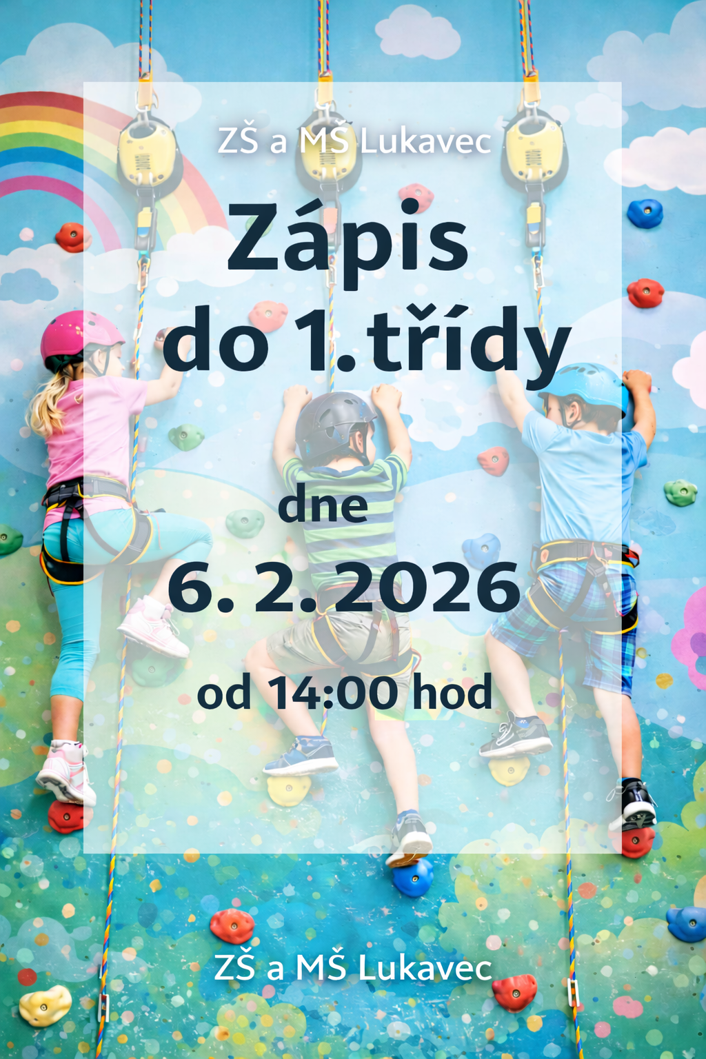 Srdečně zveme všechny budoucí prvňáčky a jejich rodiče k zápisu do 1. třídy. Čeká je milé setkání, hravé úkoly a první seznámení se školou.